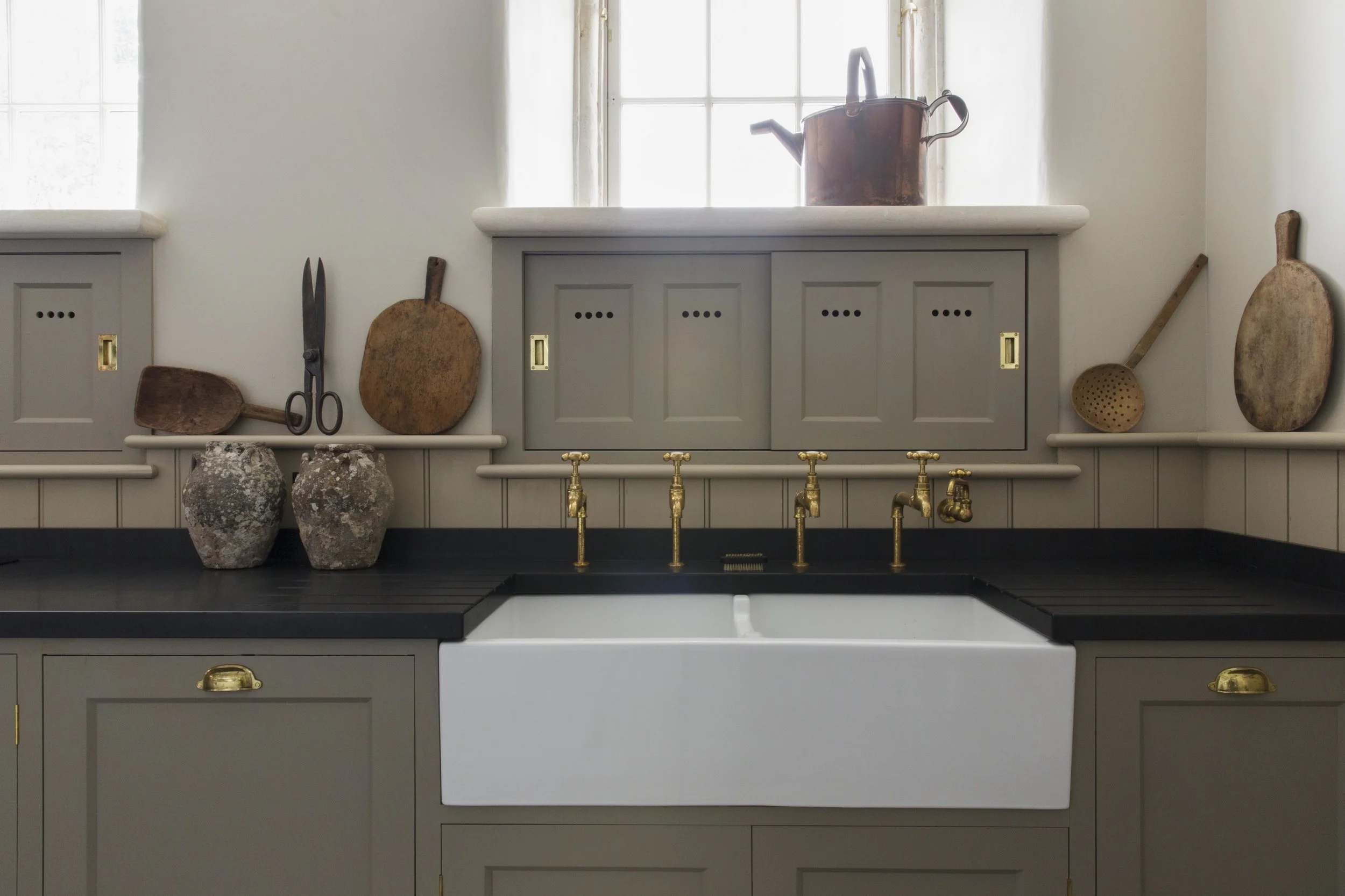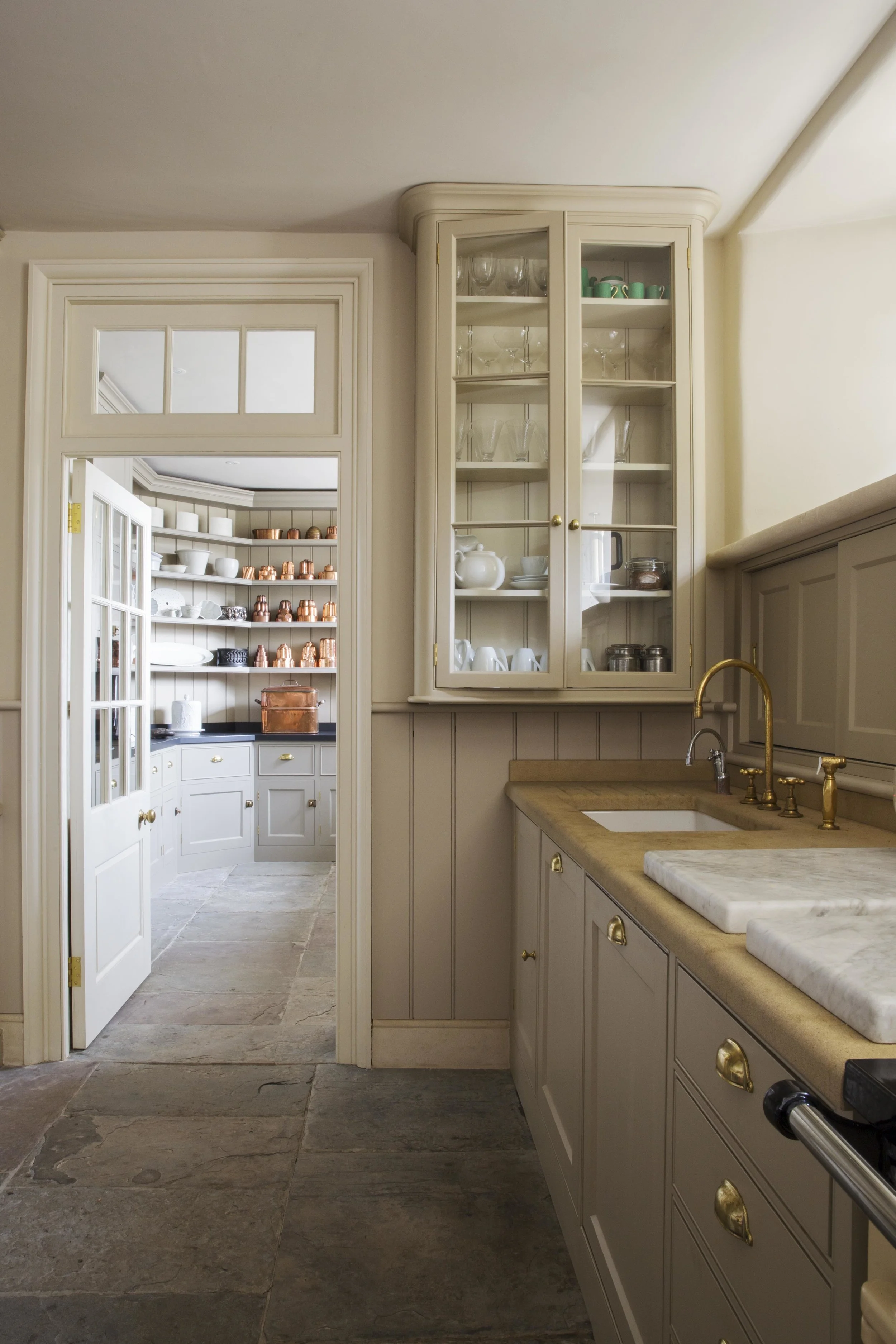 The muted colours of the cabinetry and york stone floor are great foils for the impressive collection of copper jelly moulds